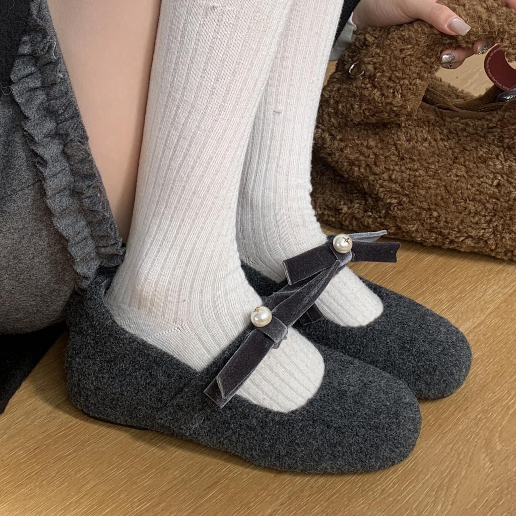 French Small Fragrant Mary Jane Shoes 2025 Velvet Warm Round Head Shallow Mouth with Skirt Knot Pearl Evening Shoes