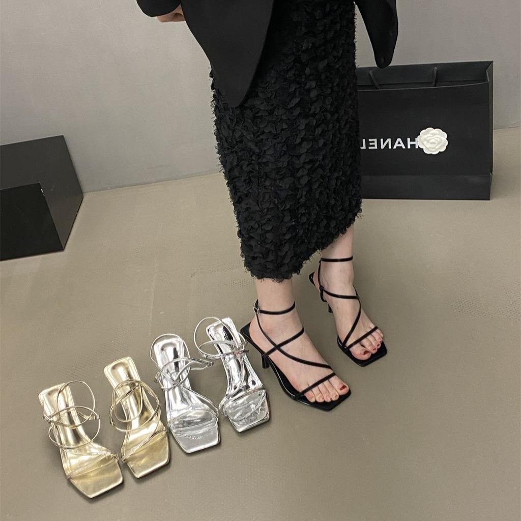2025 Spring and Autumn New French Niche High-heeled Sandals Temperament Square Head Buckle Stiletto Strap Stiletto Sandals