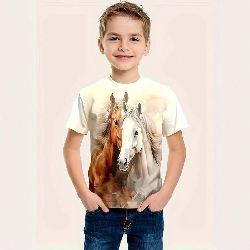 Summer Comfortable Soft Children's Fashionable 3D Printed Horse Pattern Round Neck Boys' Girls' Short Sleeved T-shirt