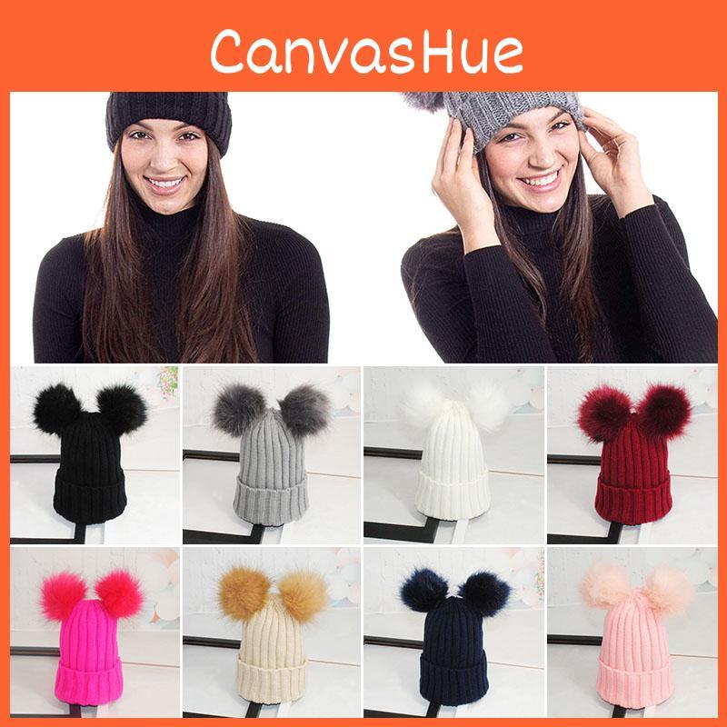 Women Winter Ladies Knitted Beanie Hat With Fluffy Double Fur Bobble Pom Cap Ski
