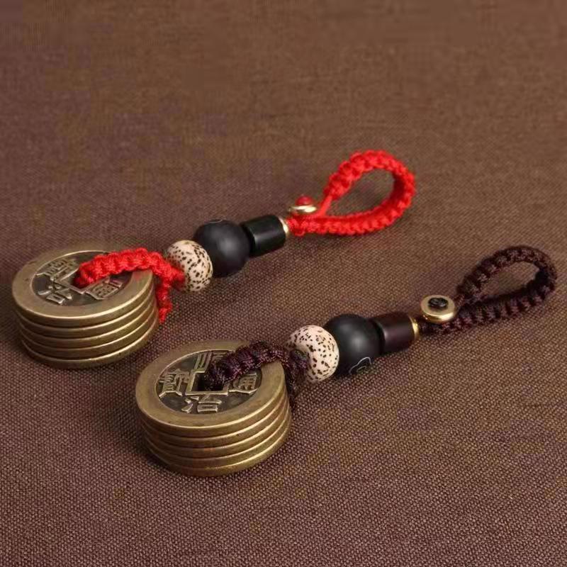 Five Emperor Coins Keychain Pendant: Brass Imitation, Woven Lanyard for Peace.