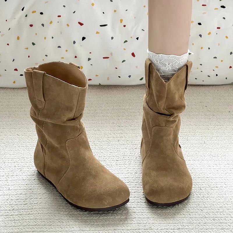 Spring Autumn Vintage Women Flats Ankle Boots Shoes Fashion Round Toe Slip On Pleated Short Booties