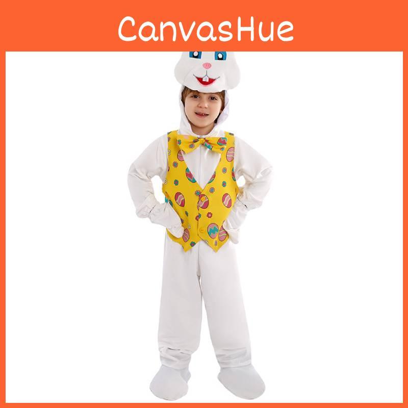 This children's stage costume features a soft polyester fabric that is comfortable for kids aged 3-8 years, with heights from 39 to 55 inches. The outfit includes a white rabbit cosplay set with colorful printed elements, suitable for Easter parties or stage performances. Measuring approximately 12 inches in length, it offers a secure fit. Easy to clean with a damp cloth, its ideal for dance, theatrical, or festive events.