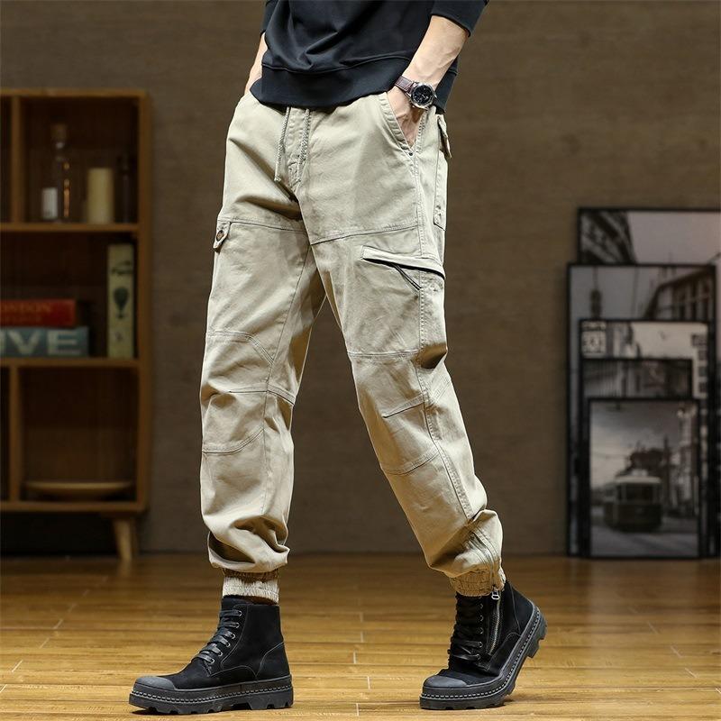 Green Men's Functional Overalls Pure Cotton Solid Color Elastic Texture Leggings Trendy Brand Multi-bag Fashion Casual Trousers