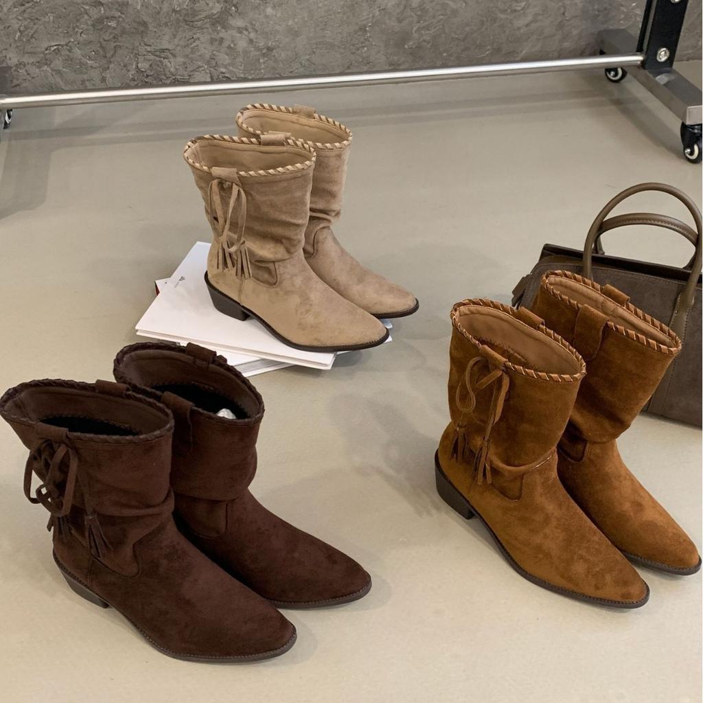 2025 New Thick Heel Pointed Western Boots Retro Tassel Medium Tube Thin Boots Versatile Suede Boots Women's Short Boots