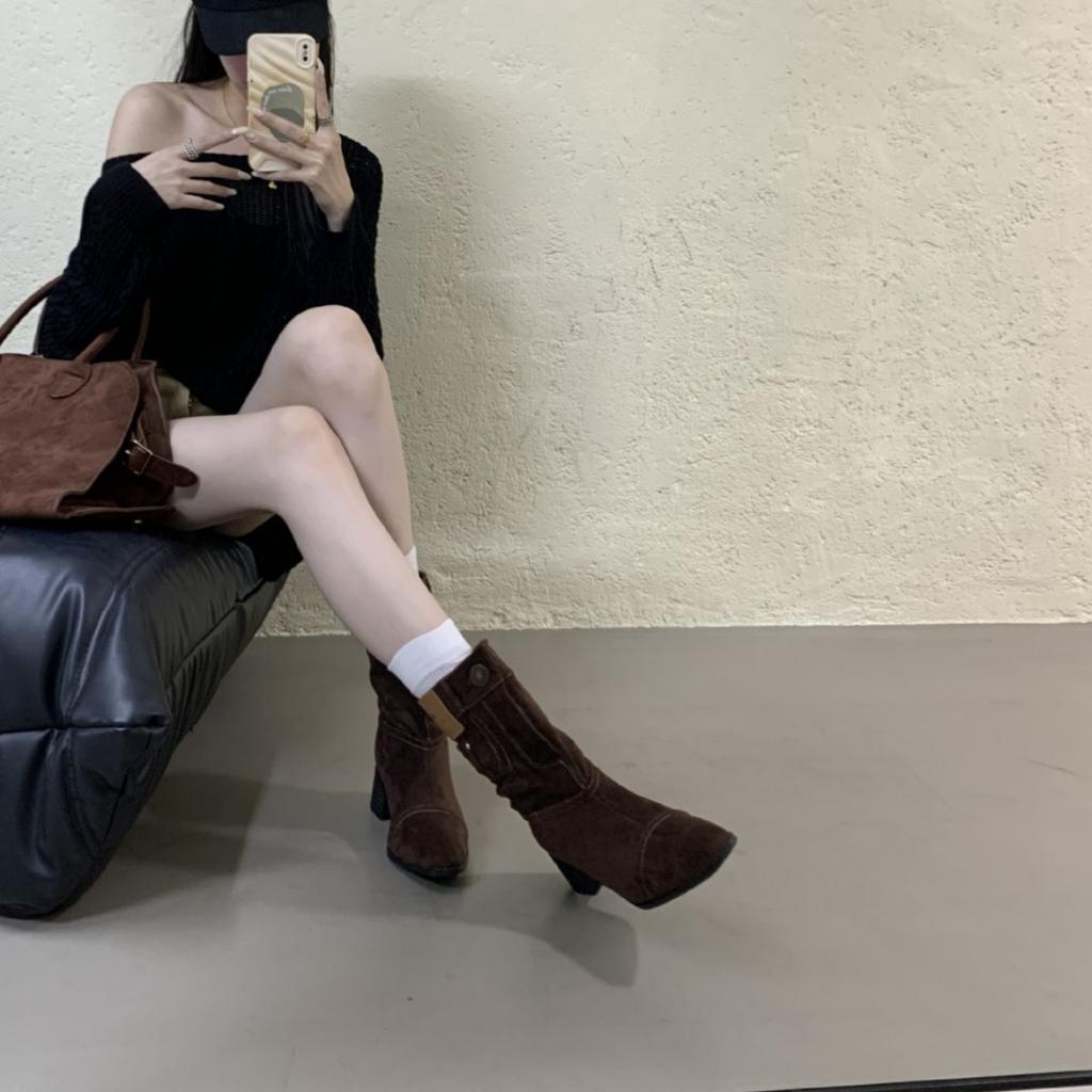 Autumn and Winter Boots 2025 New French Medium Boots Thick Heel High Boots Pleated Pile Boots