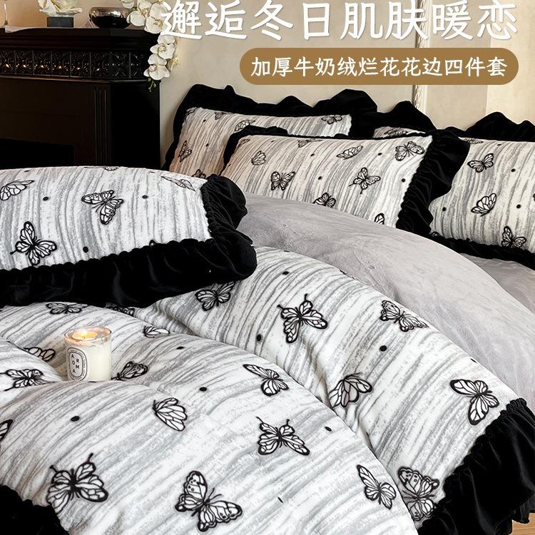 French Lace Thickened Milk Fleece Bed Four-Piece Set Double-Sided Fleece Quilt Cover Coral Fleece Princess Style Bed Sheet