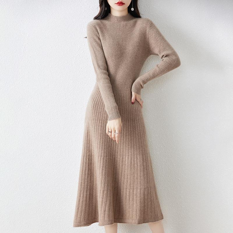 LYRIA New Women Mock Collar Dress 100% Merino Wool Pullover Skirt Autumn Winter Knitted Long Sweater Female Chic Fishtail Dress