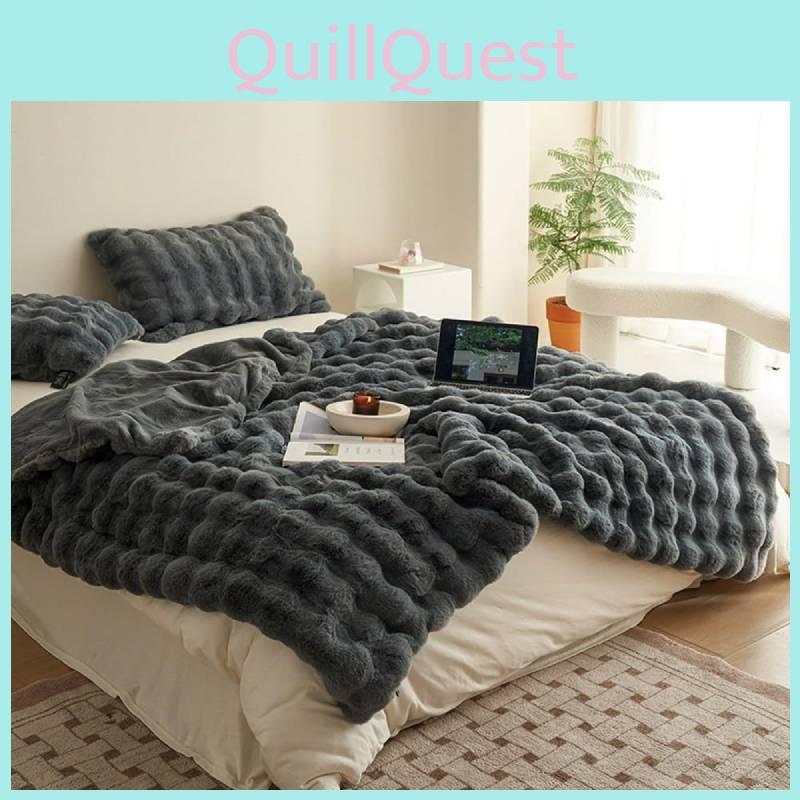 This Toscania faux rabbit fur blanket features a double-sided, plush bubble fleece design that delivers cozy warmth. Made of polyester, it suits all seasons. Perfect for relaxing on the sofa, napping at the office, or adding style to bedrooms. Keep it clean by wiping with a damp cloth.