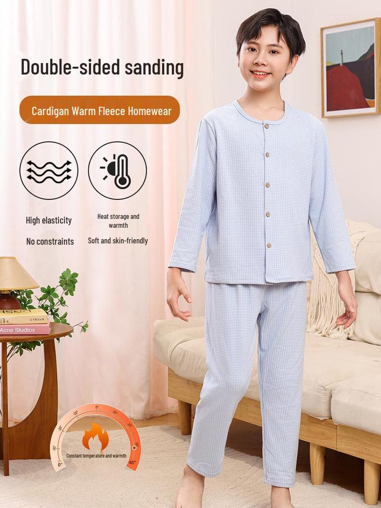 This cozy Kids' Fleece Pajama Set is perfect for keeping your little ones warm during the cooler autumn and winter months. Crafted from soft polyester, this pajama set provides exceptional comfort and durability. The set features a warm cardigan with long sleeves, designed to keep your child snug and cozy. Ideal for both bedtime and lounging around the house, this pajama set combines practicality with a delightful sense of comfort.