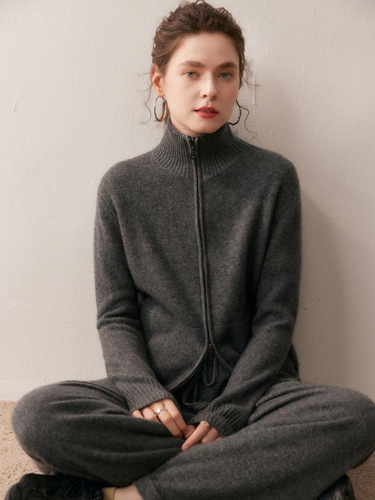2025 A/W Women's Double-Layer Cashmere Stand Collar Cardigan Sweater with Zippers and Pockets
