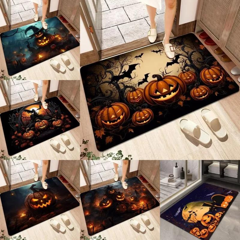 Spooky Halloween Cartoon Non-Slip Soft Washable Indoor Carpet Rug Door Mat - Pumpkin Ghost Black Cat Bat Festive Home Decoration