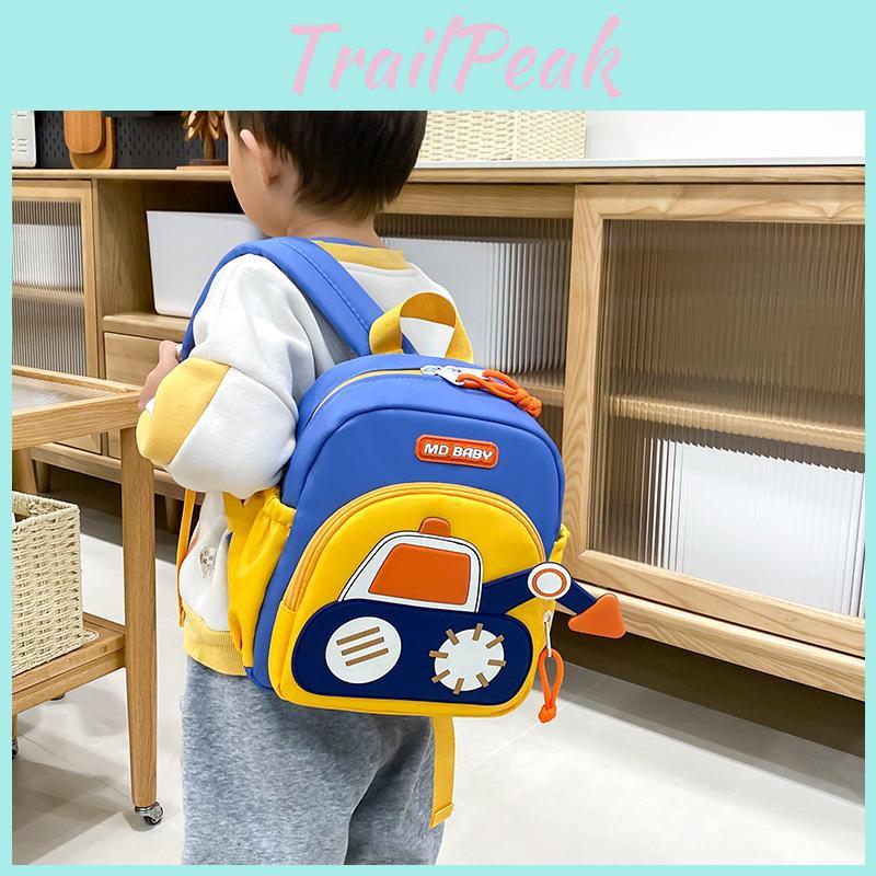 This childrens backpack features a cartoon excavator design, suitable for both boys and girls. Made of durable nylon with polyester lining, it measures approximately 22*10*25 cm, and offers breathable comfort for daily use. Ideal for preschool activities, it supports easy carrying and quick cleaning with a damp cloth.