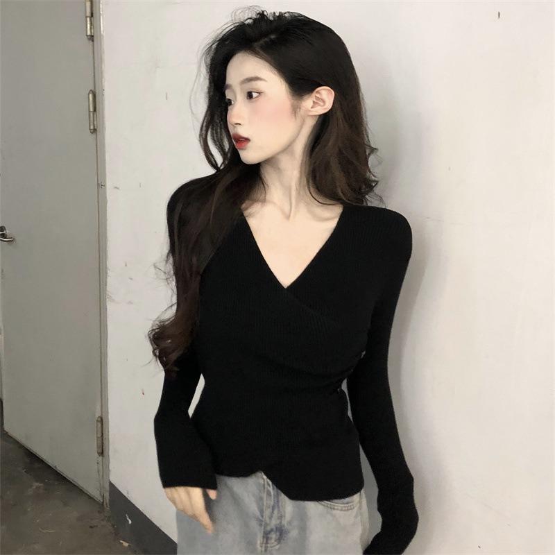 Black Deep V-neck Knitted Bottoming Shirt Popular for Women In Early Autumn, Irregular Slim Fit with Collarbone Long-sleeved Top