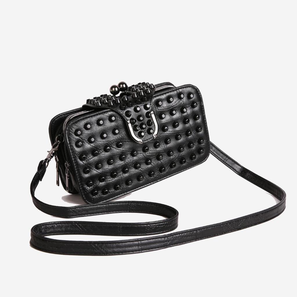 Gothic Style Textured Black Shoulder & Crossbody Bag with Rivets for Women