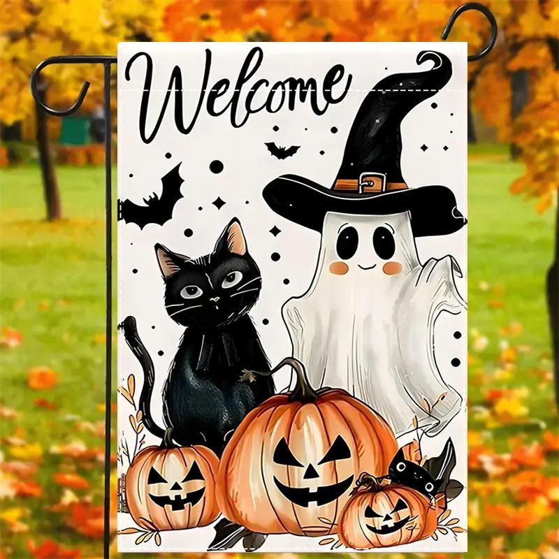 1pc Orenge Halloween Garden Flag Cute Ghost Cat Boo Print Suitable for Halloween Yard Outside Decoration No Flag Pole 12X18 Inch