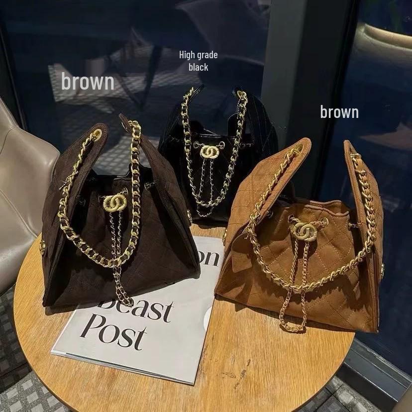Women's Genuine Leather Hobo Bag - Caviar Grain, Suede, Diamond Pattern, Chain Drawstring