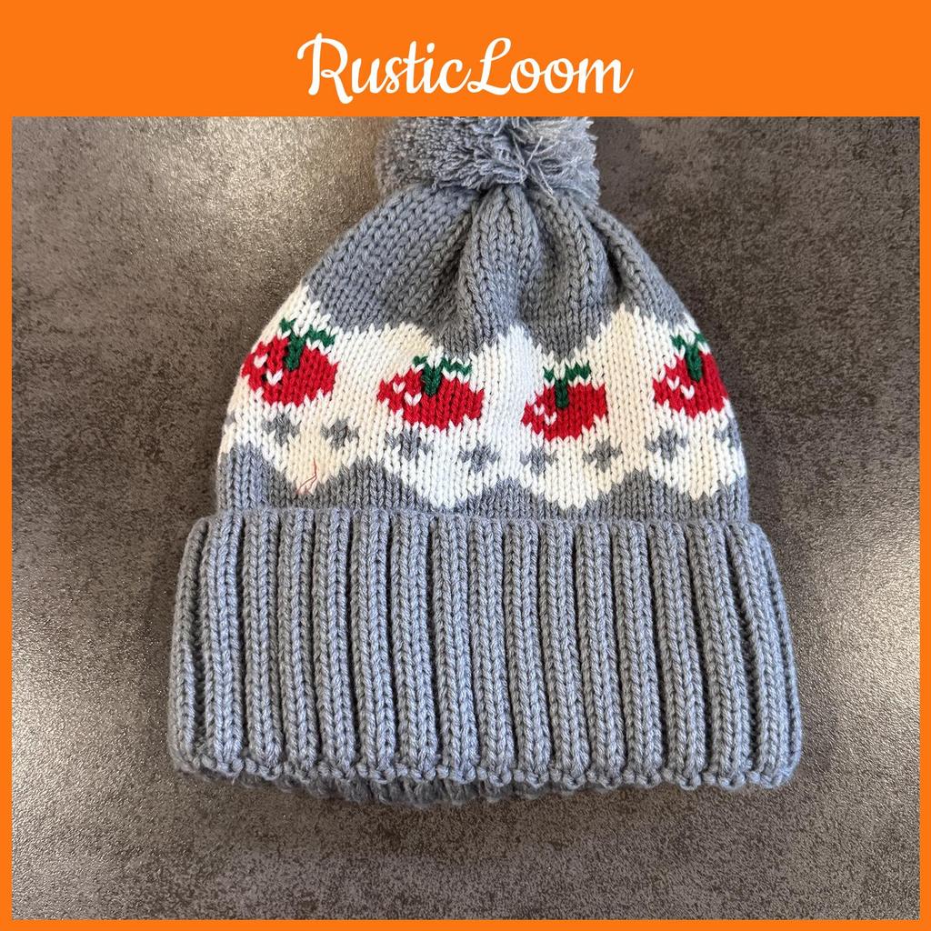 Warm Simple Knitted Hat Cherry Embroidery Design And Plush Ball Decoration