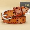 This women's leather belt features genuine two-layer cowhide material with a smooth, polished surface for lasting durability. The alloy buckle with a vintage-inspired pin clasp measures approximately 2-4cm in width and is available in lengths of 105cm, 110cm, 115cm, and 120cm. Its classic design complements casual or retro outfits, making it suitable for everyday wear or special occasions. Easy to care for, wipe clean with a damp cloth to maintain its appearance.
