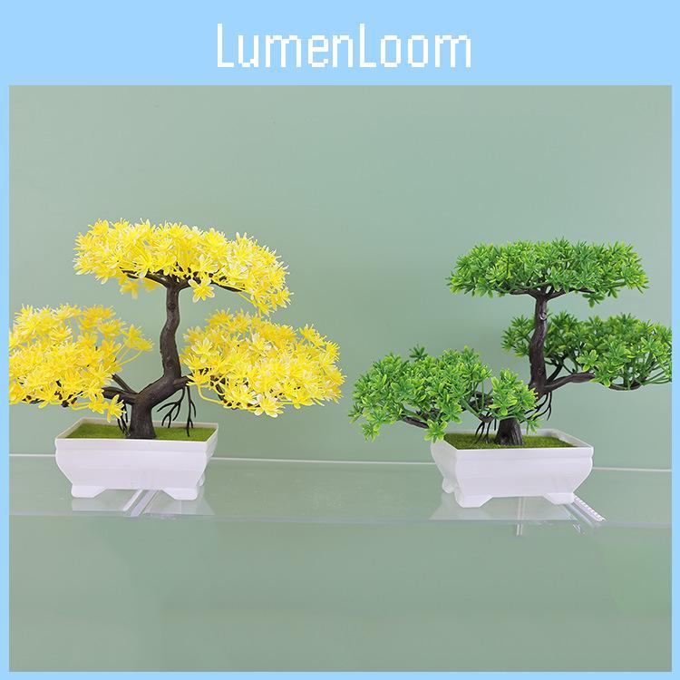 This artificial pine bonsai sculpture features a realistic design and vibrant color options, including green, purple, yellow, red, lotus, pink, and crimson. Made of durable plastic through injection molding, it measures 7.5 inches tall, providing a natural appearance without maintenance.