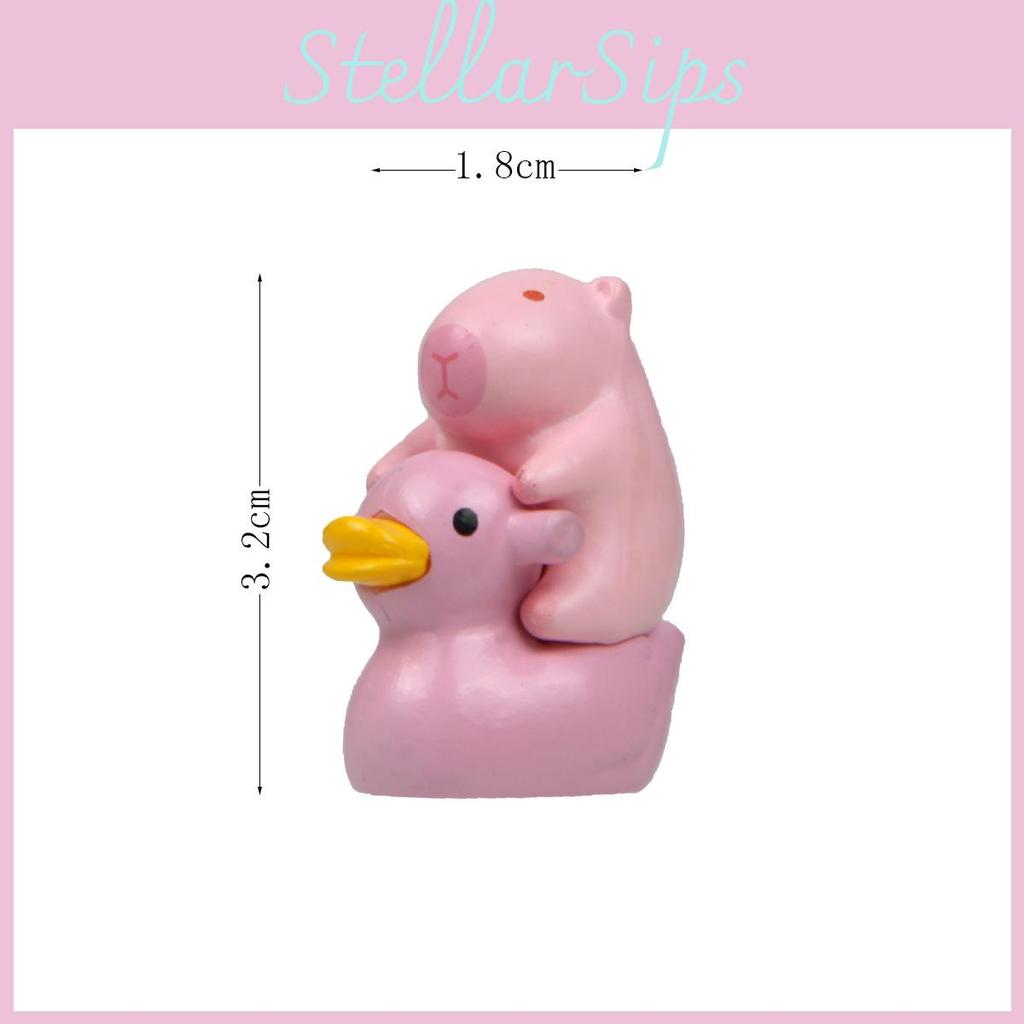 This collection features eight PVC figurines depicting sitting yellow ducks, water pigs, and capybaras in playful poses. Each piece measures approximately 3 cm in height, crafted with injection molding for durability. Ideal for garden decor, desk embellishments, or gifting during birthdays and holidays. Wipe clean with a damp cloth for maintenance.