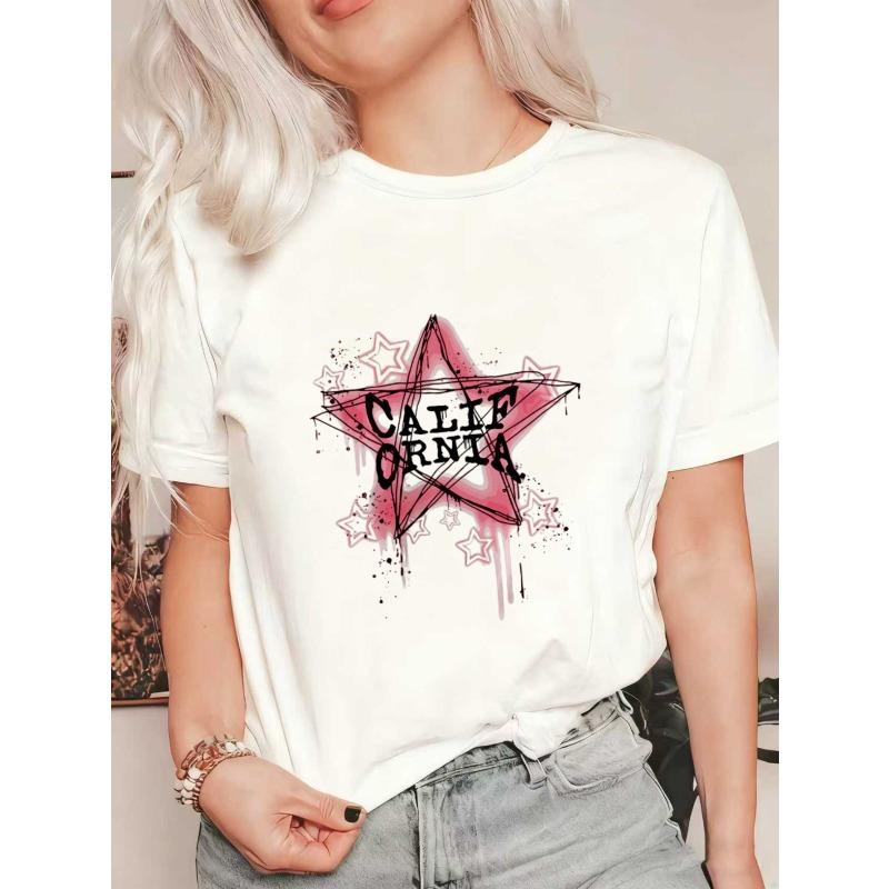 Oversized T-Shirt Black Pink Star Graffiti Print With Text Cali Born For The Night Casual Streetwear Style For Women