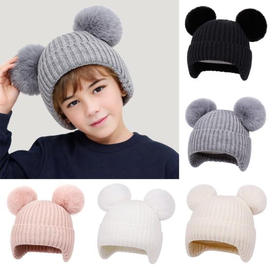 Kids Knitted Hat Dual Fur Ball Decor Ear Protection Warm Hat Solid Color Elastic Warm Windproof Hat Headwear