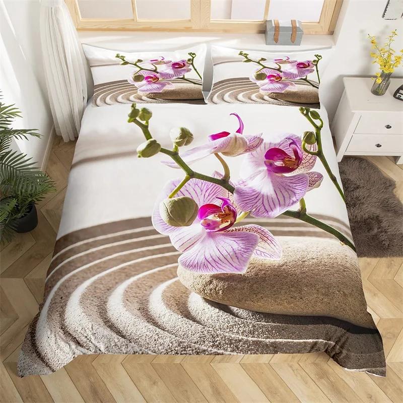 Zen Stones King Duvet Cover Sandy Beach Bedding Set Microfiber Purple Phalaenopsis Comforter Cover Meditation Bedspread Cover