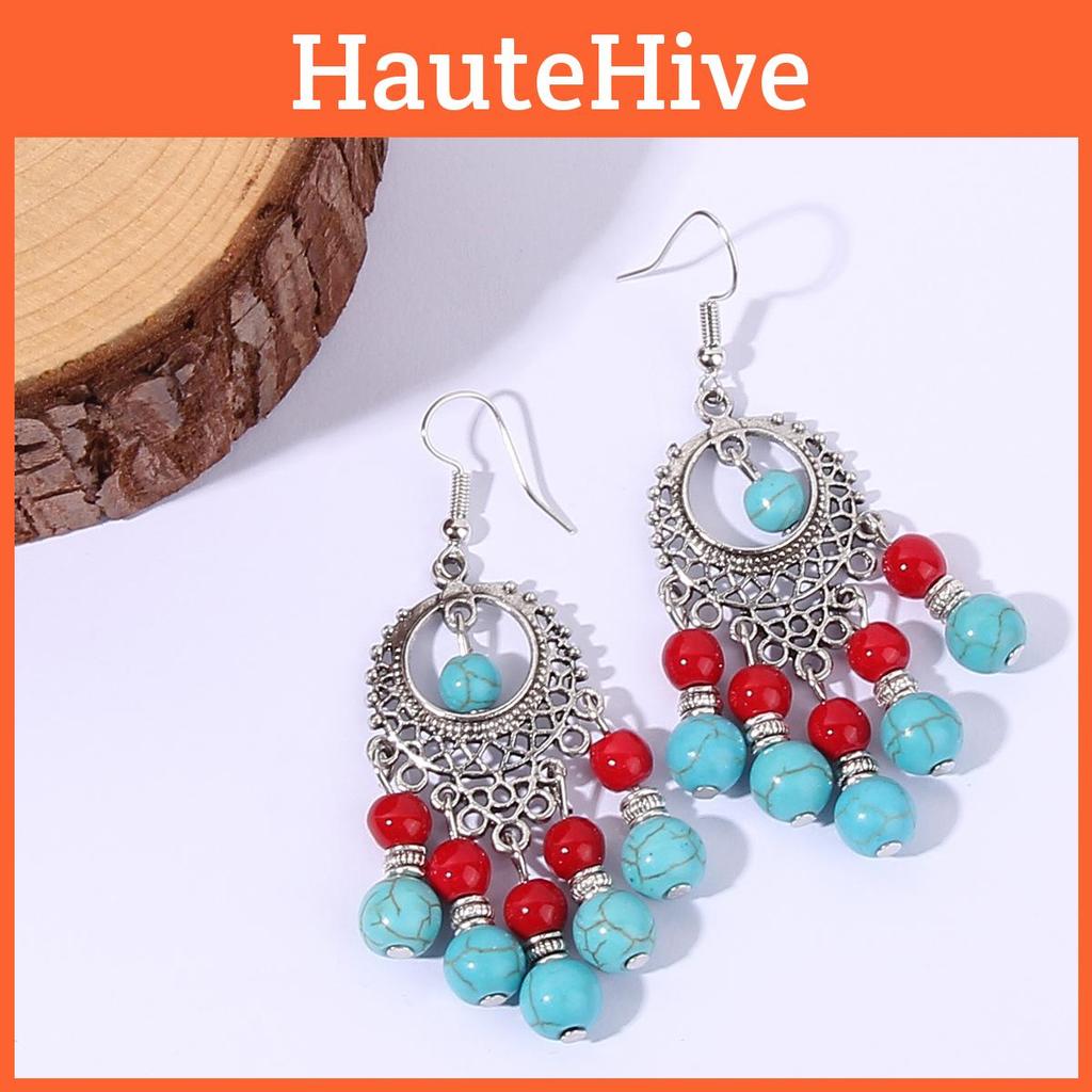 These bohemian-inspired tassel earrings feature a water-drop shape crafted from durable alloy. they showcase intricate handwork with traditional accents and vibrant turquoise, red, or sky blue colors. Ideal for festival, vacation, or cultural events, they add a vintage ethnic touch to any outfit. Wipe clean with a soft cloth to maintain their vibrant finish.