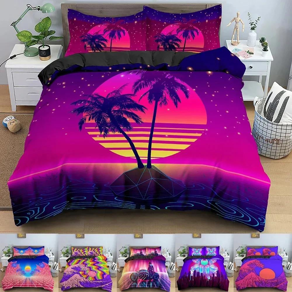 Retro Bedding Set Abstract Duvet Cover Set Waves And Sunset Pattern Comforter Cover With Pillowcase King Queen Home Textiles