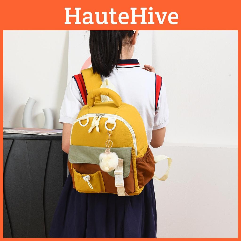 Blocked Color Childrens Backpack With Plush Pendant For School And Outings