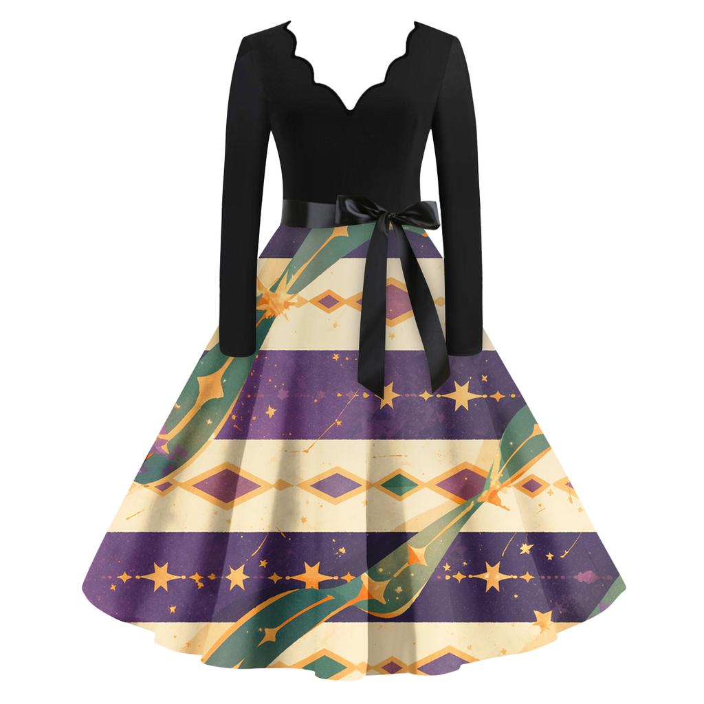 Women's Casual Fashion V Neck Long Sleeve Printed Vintage Long Dress