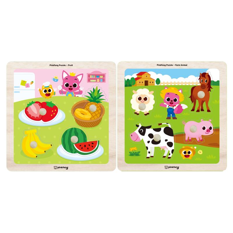 A dual-theme Pinkfong wooden peg puzzle set designed to help toddlers learn fruits and farm animals through hands-on, safe, and engaging play.