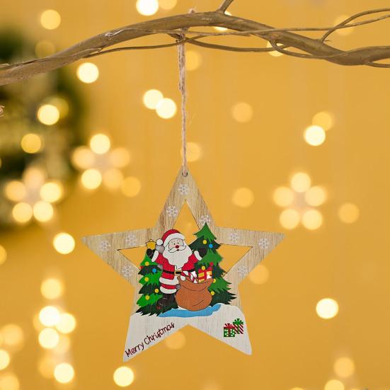 The star-shaped pendants showcase four unique holiday-themed patterns, including reindeer, Santa Claus, snowman, and elk combined with Christmas trees, capturing diverse Christmas imagery.