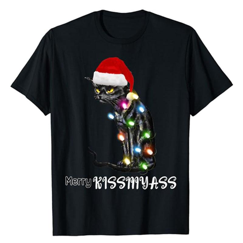 Merry Kissmyass Funny Cat Christmas Lights T-Shirt Xmas Costume Gifts Kitty Lover Graphic Outfits Cute Kitten Saying Tee Y2k Top