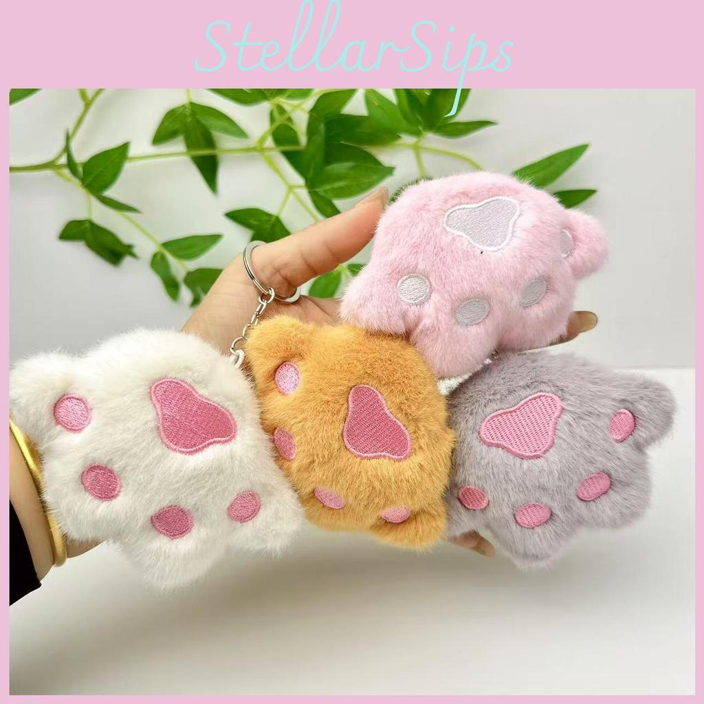 This plush cat paw keychain features a soft, short pile plush construction, crafted with high-quality PP cotton filling. Measuring 3.15 inches in height, it includes an 3.15-inch chain and a gold keyring for easy attachment. Ideal for decorating bags, backpacks, or as a thoughtful gift. Wipe clean with a damp cloth to maintain its softness.