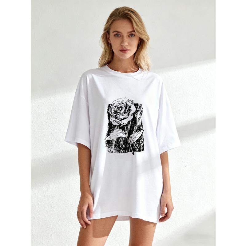Oversized T Shirt Black Rose Print Graphic Tee Casual Streetwear For Women Summer Outfit