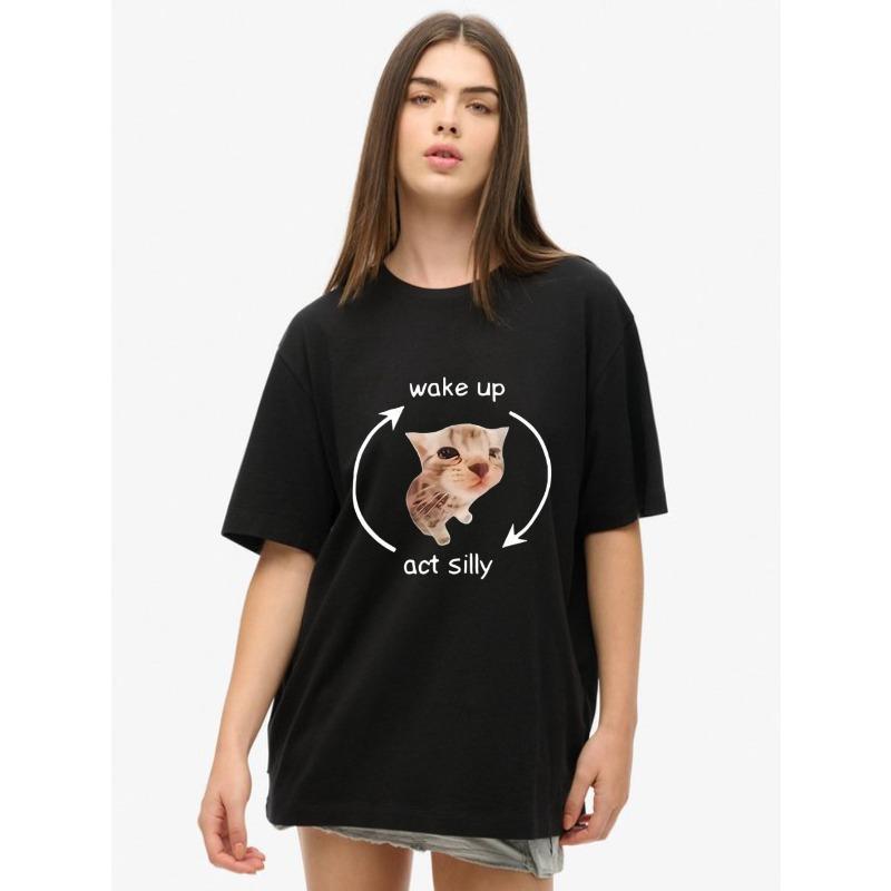 Oversized T-Shirt Black Cat Print Wake Up Act Silly Graphic Tee Casual Everyday Wear