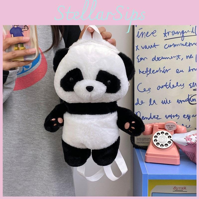 This plush animal-shaped backpack features a charming panda and brown bear design, combining cute aesthetics with practical function. Made of soft polyester fabric. Its lightweight construction makes it ideal for casual travel and daily use.