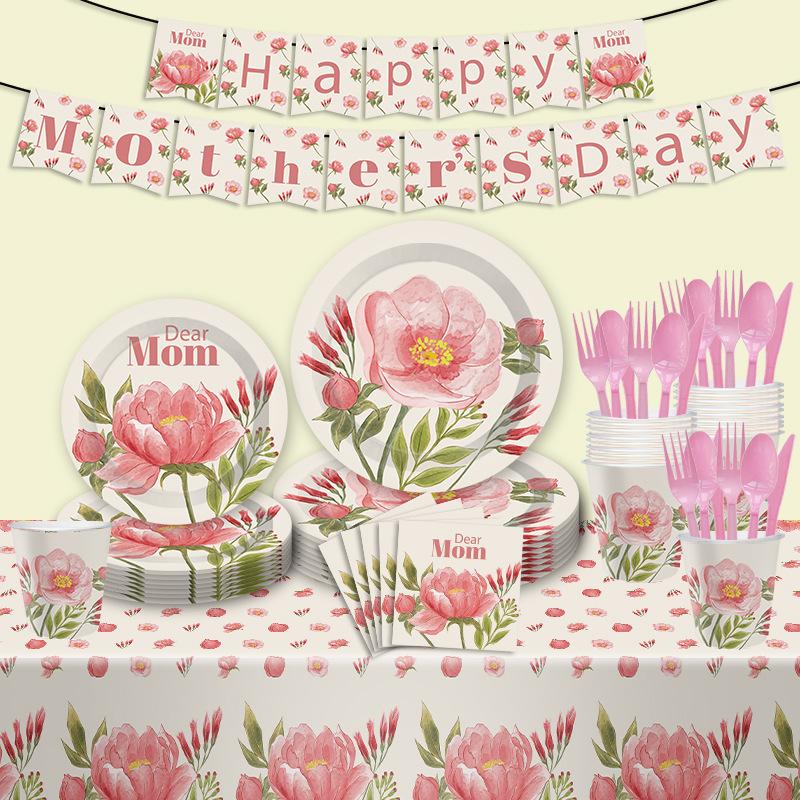 Mother'S Day Pink Flower Party Set Disposable Paper Plate Tissue Paper Cup Flag Party Decoration