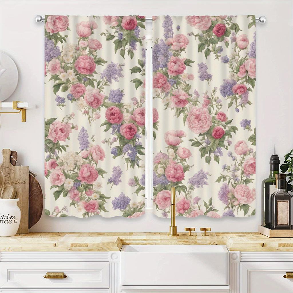 2Pcs Glam Style Floral Printed Curtains, Semi-Sheer Polyester Drapes With Rod Pocket, Machine Washable, Decorative Unlined Windo