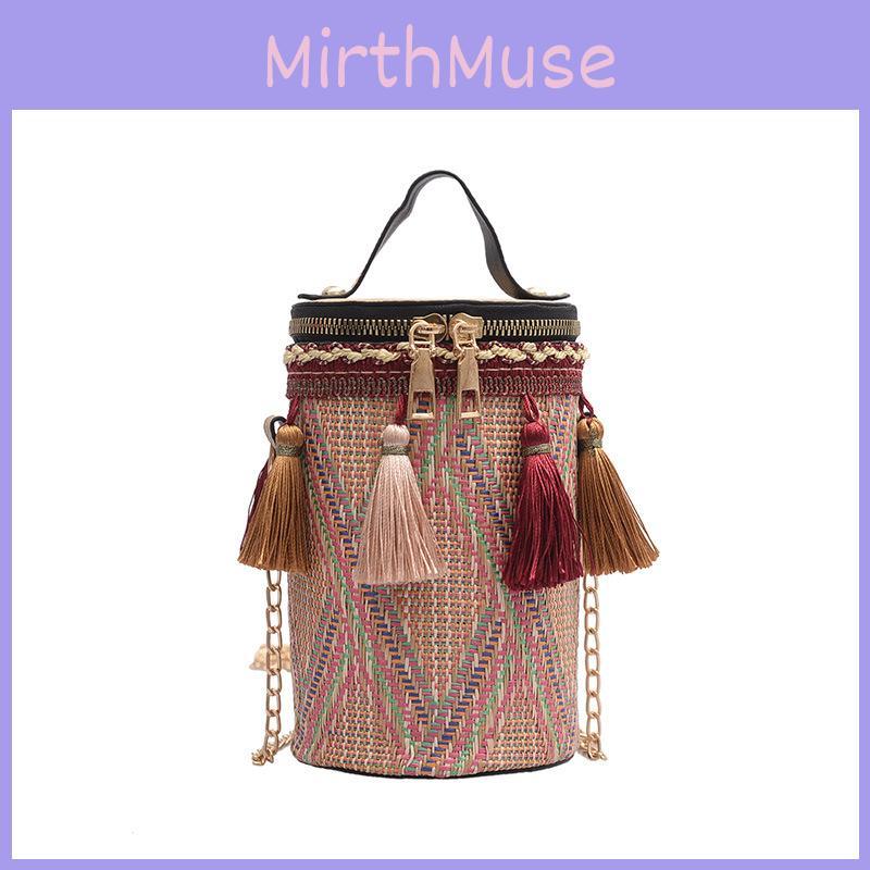 ethnic style handbag, straw bucket bag, small shoulder bag, tassel mini bag, boho crossbody purse, woven summer bag, trendy circle bag, casual travel pouch