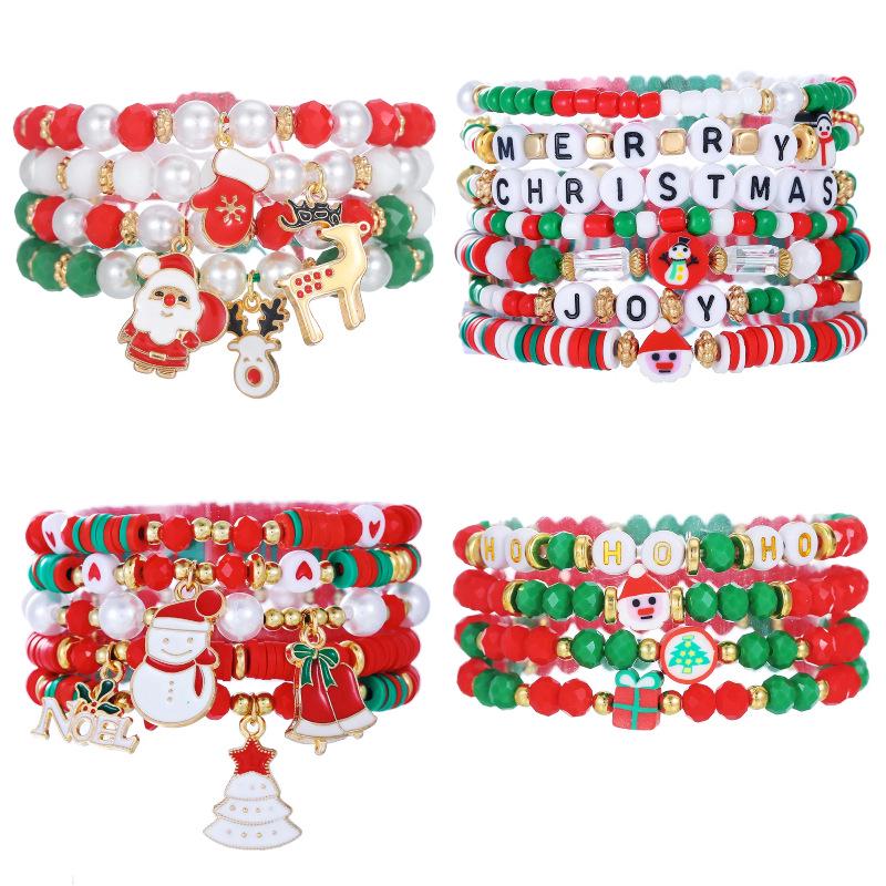 Christmas Charm Bracelet Set: Santa, Reindeer & Bell Beaded Pearl Polymer Clay Design