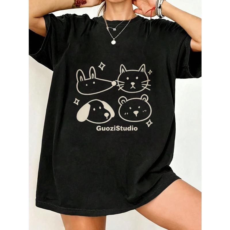 Oversized T Shirt Black Animal Faces And GuoziStudio Text Graphic Print Casual Wear For Women Summer Streetwear Fashion