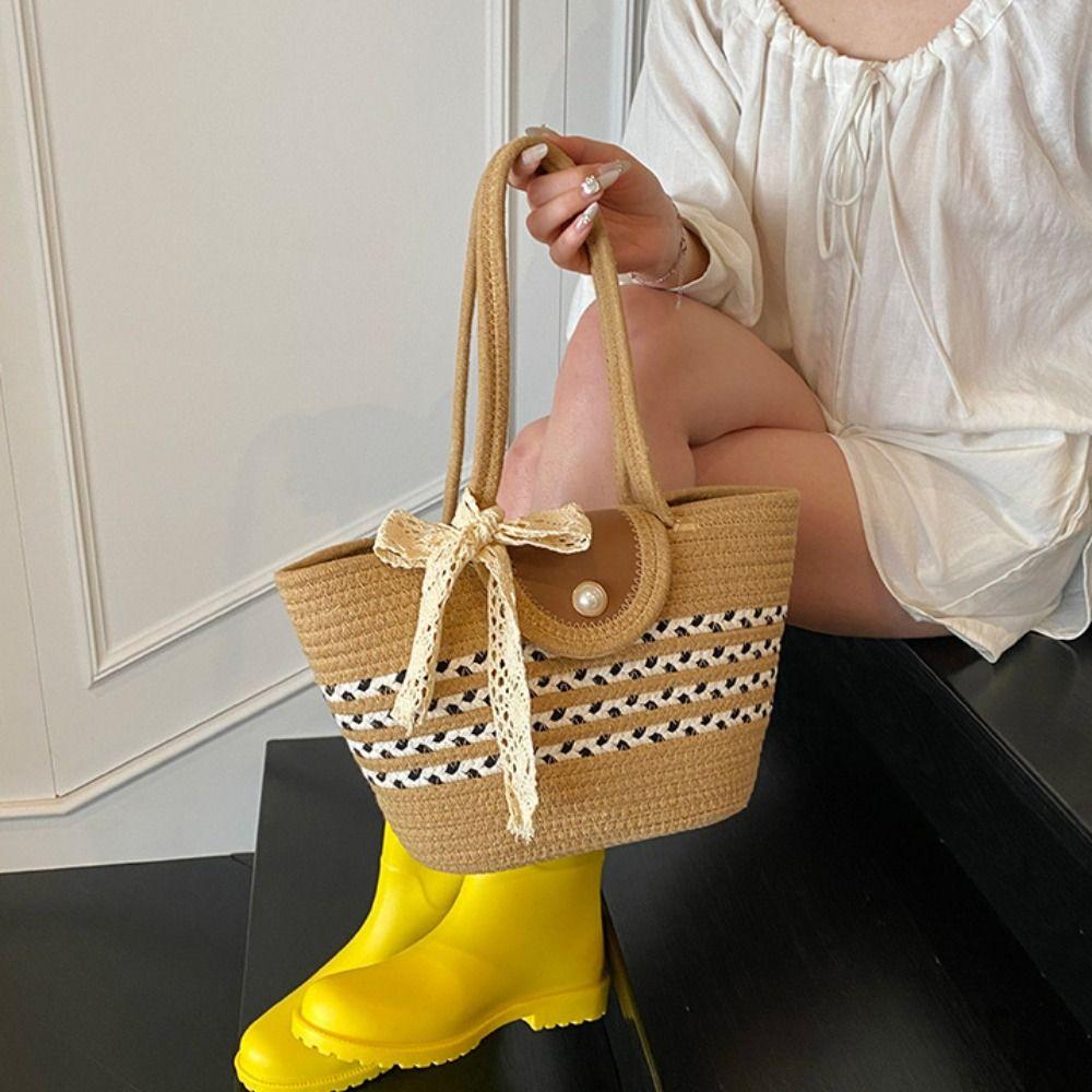 With Ribbon Woven Tote Bag Shoulder Bag Summer Beach Bag Simple Stripe Tote Handbag Daily