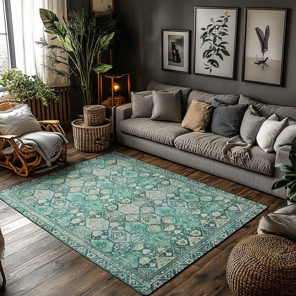 Green Bohemian Area Rug, Floral Pattern Non-Slip Carpet, Cozy Living Room Mat for Natural Home Decor
