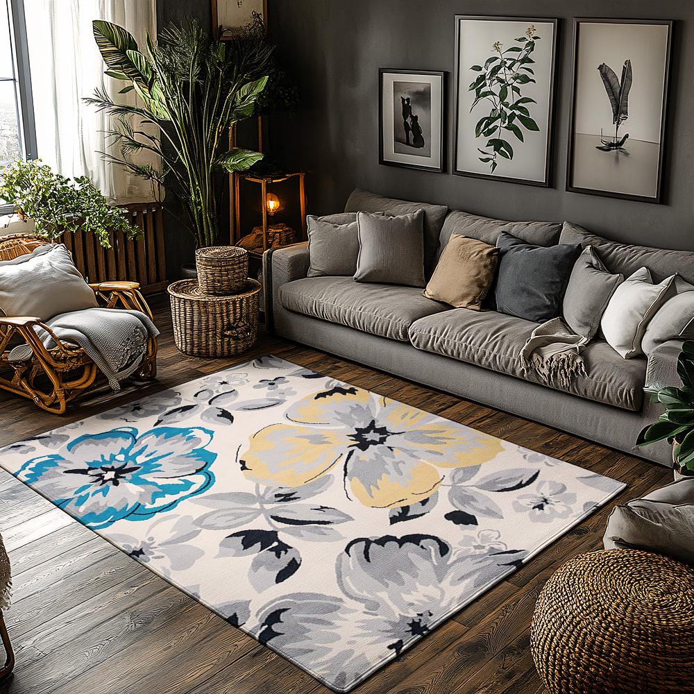 Cream Floral Bohemian Rug, Multicolor Pattern Non-Slip Carpet, Cozy Living Room Mat for Vintage Home Decor