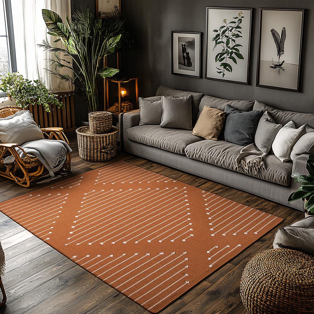 Orange Geometric Bohemian Rug, White Line Pattern Non-Slip Carpet, Modern Living Room Mat for Cozy Home Decor