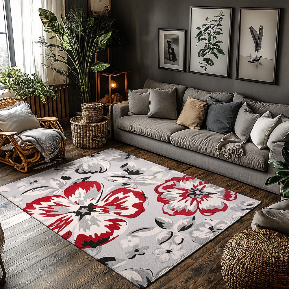 Red White Floral Bohemian Rug, Non-Slip Vintage Living Room Carpet, Soft Gray Background Floor Mat for Home Decor