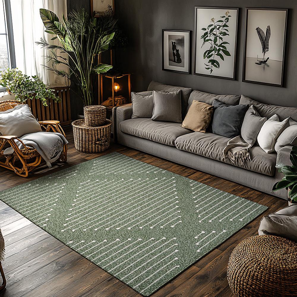 Dark Green Geometric Bohemian Rug, White Line Pattern Non-Slip Carpet, Natural Living Room Mat for Cozy Home Decor